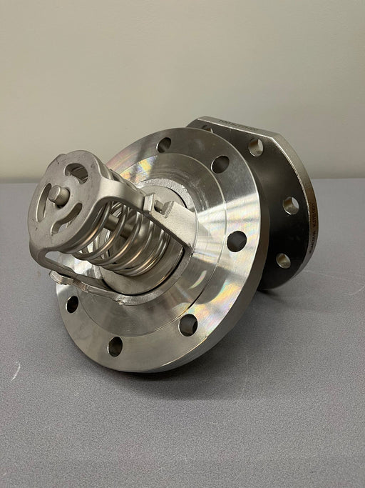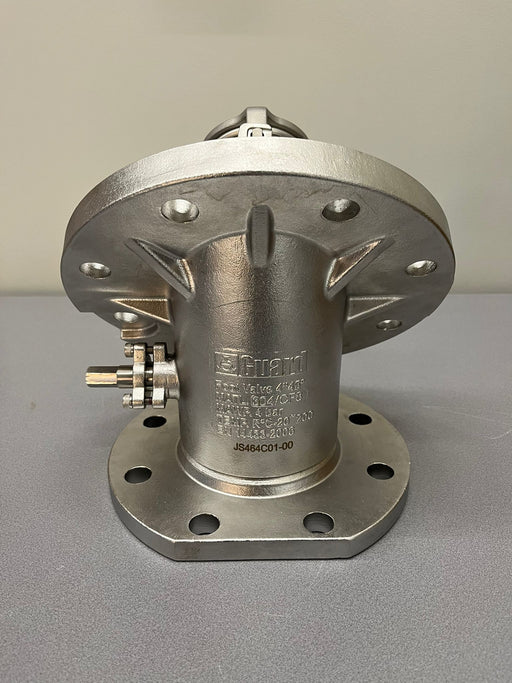 4" Foot Valve voor tankwagen en tankcontainer inlaatflens geboord 8x 18mm gaten met gelijke afstand op een 210 mm PCD; uitlaatflens geboord 818 gaten met gelijke afstand op een 180mm PCD. Contact delen in 316 roestvrij staal met FEP/Silicium afdichting.